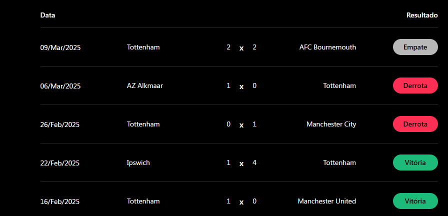 O Tottenham entra em campo sob grande pressão. Após ser eliminado há um mês da Copa da Inglaterra e da Copa da Liga Inglesa, o clube precisa vencer para evitar a eliminação de mais uma competição. Na partida de ida, o time foi derrotado por 1 a 0 pelo AZ Alkmaar, reforçando uma fase negativa que persiste nesta temporada. Em 16 jogos, o Tottenham acumula nove derrotas, seis vitórias e apenas um empate desde o início de 2025.